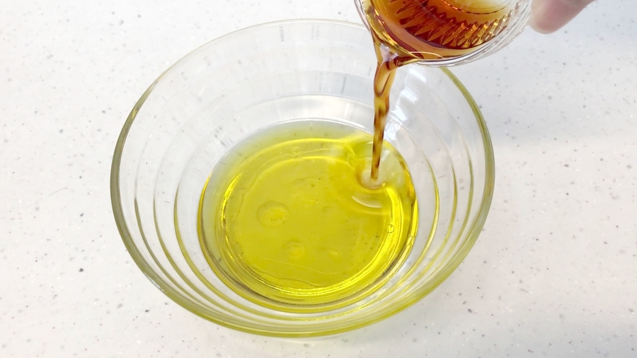 ボウルに(B)の酢大さじ1、オリーブオイル大さじ2、淡口醤油大さじ1/2、マスタード小さじ1~、砂糖小さじ1を混ぜます。