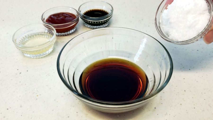 合わせ調味料(A)(淡口醤油大さじ3、砂糖大さじ2、ケチャップ大さじ1と1/2、ウスターソース小さじ2、レモン汁小さじ2)を作っていきます。