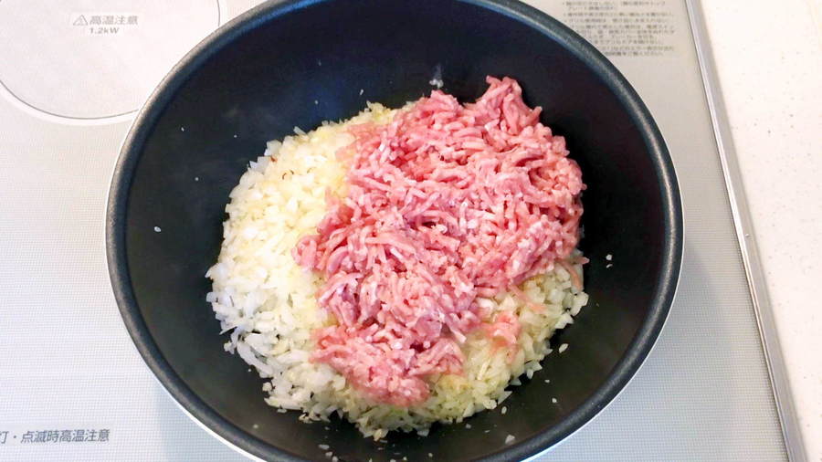 ごま油大さじ1を熱し、みじん切りしたニンニク大さじ3と赤唐辛子をじっくりと炒め、香りを出していき、ニンニクが色づき、赤唐辛子が少し黒ずんできたらタマネギを入れ、サッと1分ほど炒め、鶏ひき肉200gを入れ、火を通します。