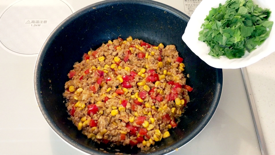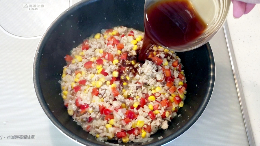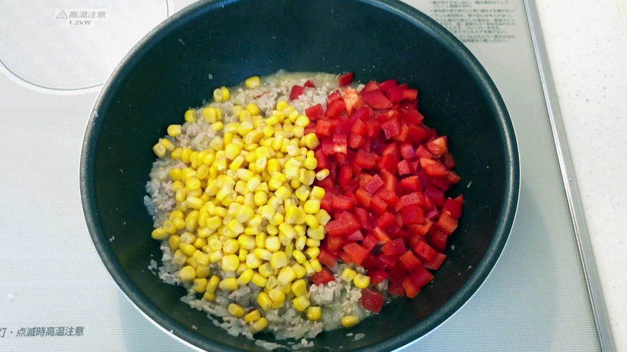鶏肉に火が通ったらパプリカとコーンを加え、1分ほど炒めます。