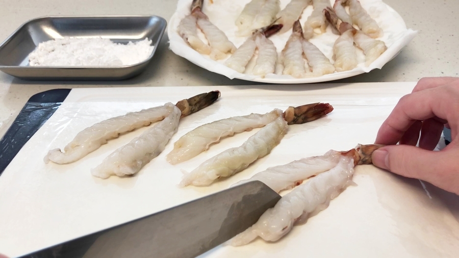 エビ12尾は塩水で洗い、尾を残して、殻をむき、身の部分を頭から尻尾の手前まで切り開いて背ワタを取ります。