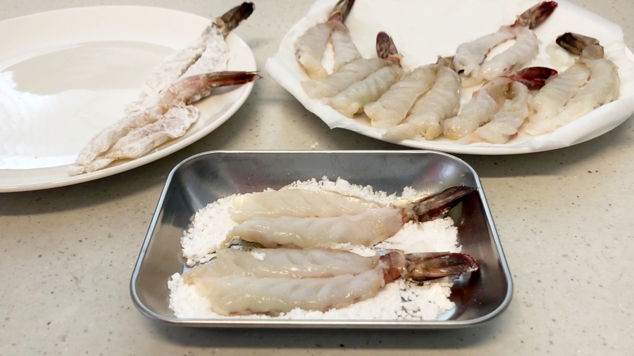 エビの水気を拭いたらエビに片栗粉大さじ2を満遍なくまぶし、余分な片栗粉は、はたき落とします。