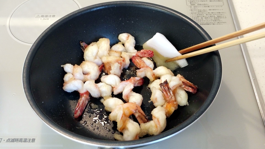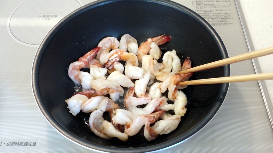 フライパンでお玉1杯の油を熱し、エビが熱で巻かれ、カリッとなるまで炒めます。この時、フライパンを傾け油をためて、油を回しかけながらあげると少量の油でもカリッと揚がります。