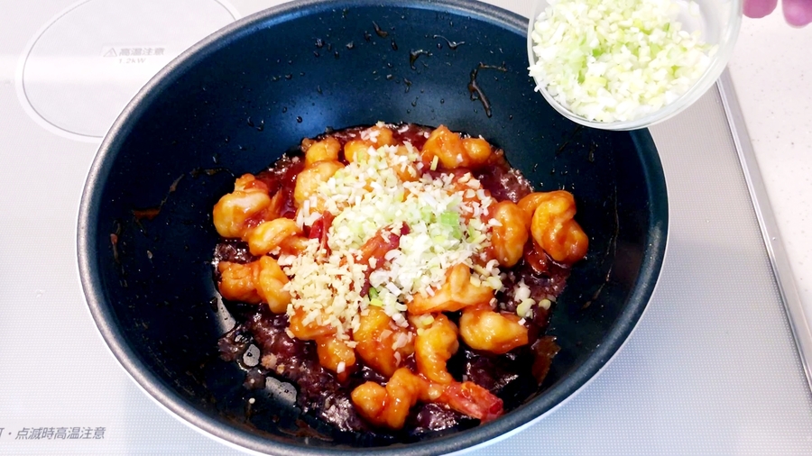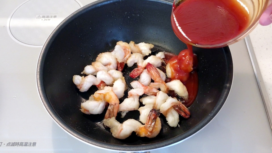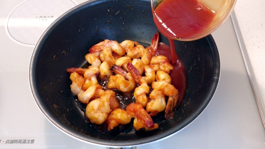 再度、火をつけて合わせ調味料の1/2をエビに回しかけ、全体に味を絡ませます。