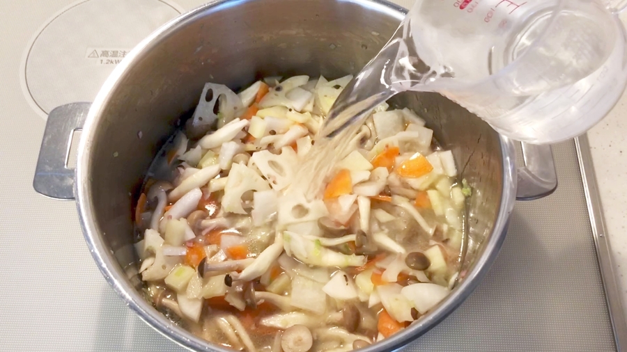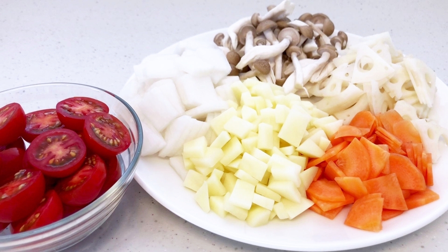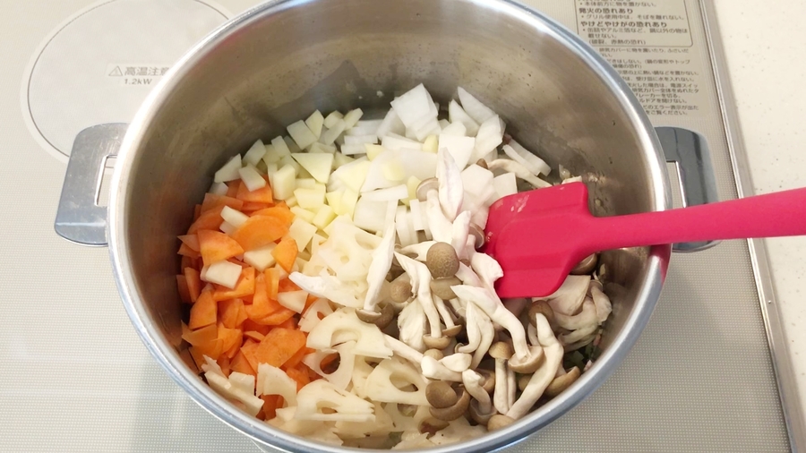 ジャガイモ、ニンジン、レンコン、大根、しめじ(トマト以外の食材)を入れ、さらに1~2分炒めます。