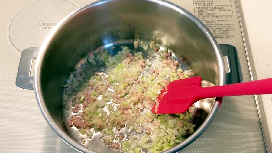 鍋に油大さじ1/2を入れ熱し、みじん切りしたベーコン1枚、粗みじんのネギ大さじ3、みじん切りしたショウガ大さじ1を1~2分ほど炒めます。