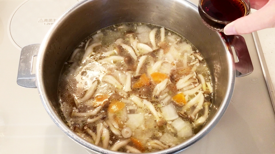 続いて、淡口しょうゆ大さじ2~と鶏がらスープの素小さじ1を入れ、4~5分クツクツ煮ます。