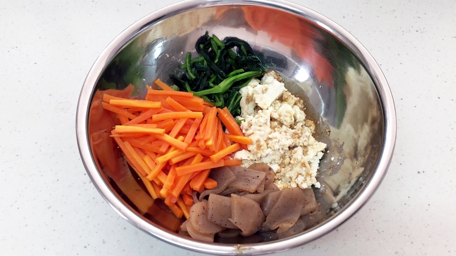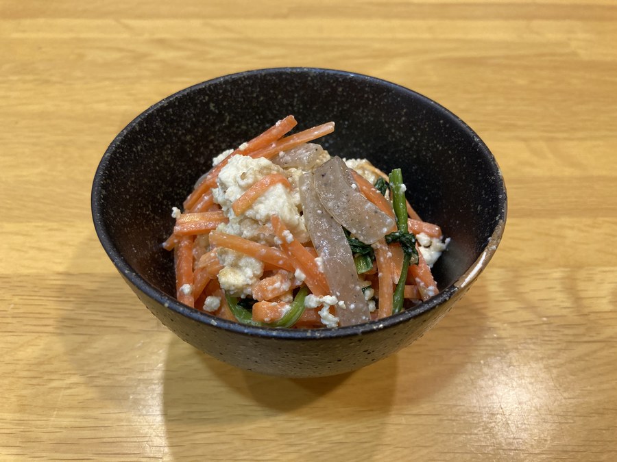 ボウルに砕いた木綿豆腐を入れ、ザックリと大雑把に混ぜて、ニンジン、青菜、こんにゃくも加え、豆腐の存在感が残るようにザックリ混ぜます。