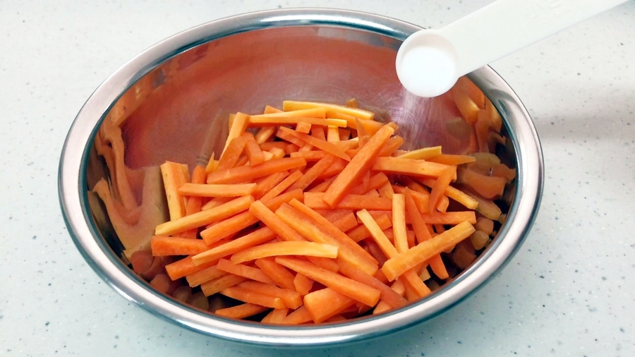 塩を少々振り、軽くもんで5分くらい置き、ニンジンから甘みを出します。