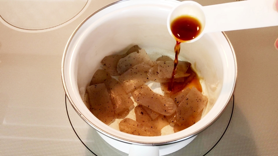 鍋に入れて、乾煎りして、プリンプリンと音がしてコンニャクの表面が乾燥してきたら、淡口醤油を入れます。