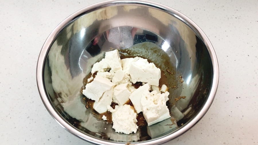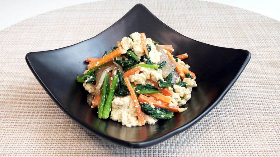 *キッチンペーパーで軽く水を吸い取ると、パサパサになりすぎず、豆腐のゴロゴロした存在感を味わえます。