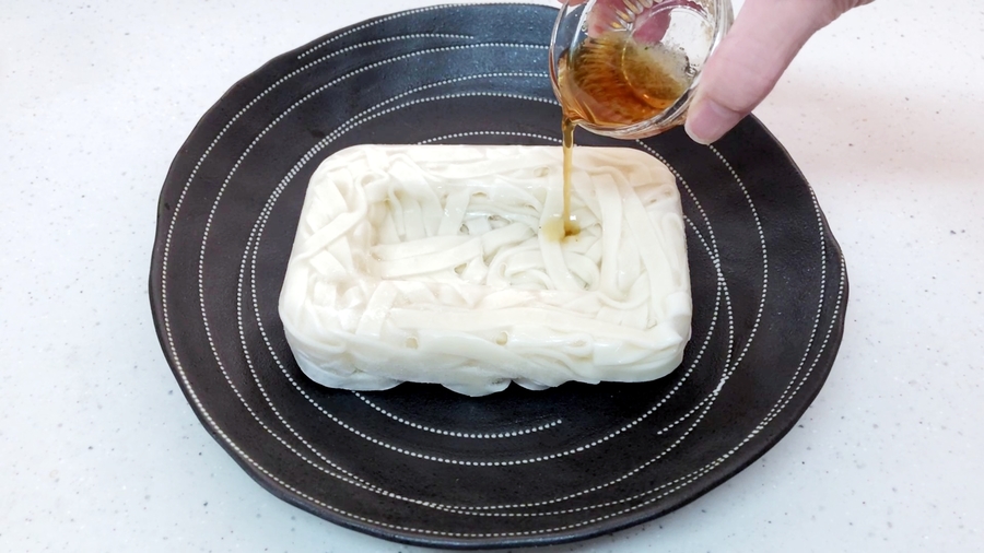 【A】(ヒガシマルのうどんスープ1/4袋を水大さじ1/2で溶いたもの)を冷凍きしめんに振りかけます。