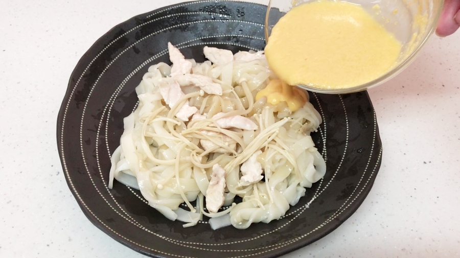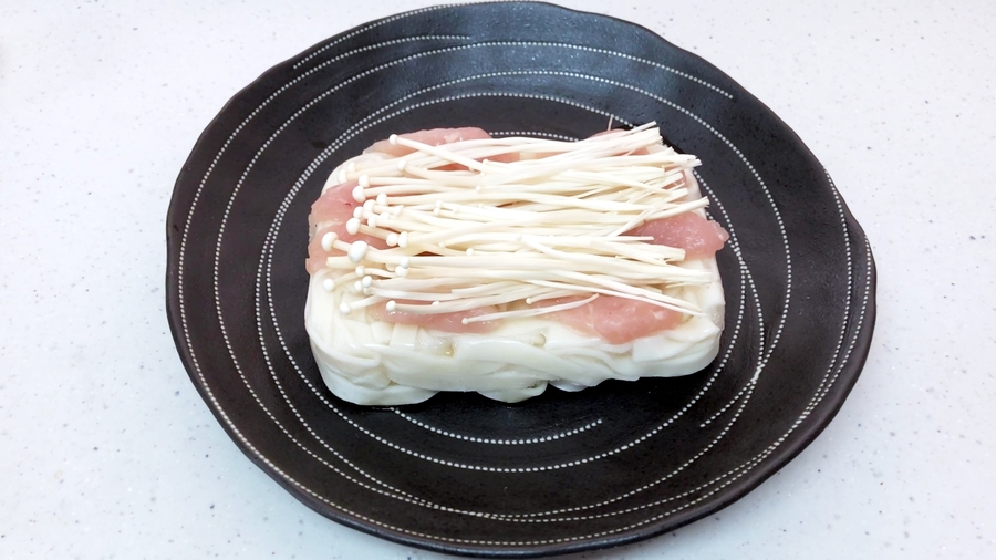 【A】を振りかけた冷凍きしめんの上に鶏胸肉とえのきを散らします。