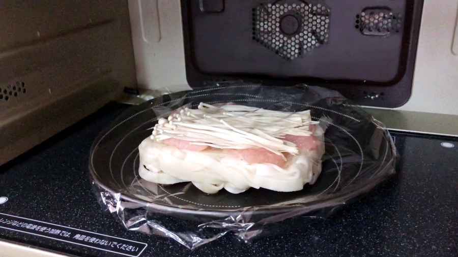 お皿にラップをかけ電子レンジ600Wで4分30秒、もしくは500Wで5分30秒、加熱します。