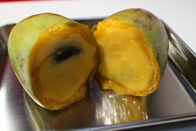 表面の色は緑色で、切って中を見ると、種がとあって、黄色い果肉に種があります。この果肉はねっとりして独特な甘みが特徴のため、「森のカスタードクリーム」と言われてるそうです。