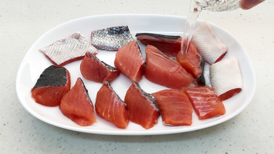 余分な粉をはたき落として、鮭の表面に片栗粉がうっすらついている状態にします。