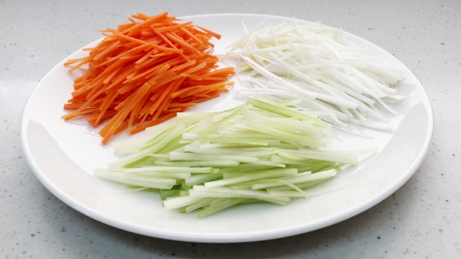 酒で鮭を漬け置きしている間に、セロリ1/3本のスジを取り、ニンジン長さ4㎝の皮をむき、セロリ、ニンジン、白ネギ1/2本をそれぞれ、繊維に対して平行に細く切ります。