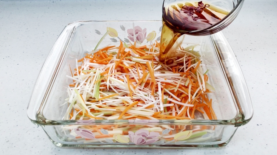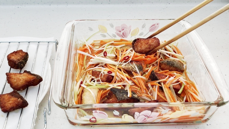 まだ鮭が熱いうちに南蛮酢に30分以上漬け込みます。
