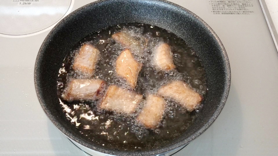 片栗粉がうっすらついた鮭を、お玉3杯分の油でカリッと揚げます(多少、揚げすぎているくらいで良いです)。