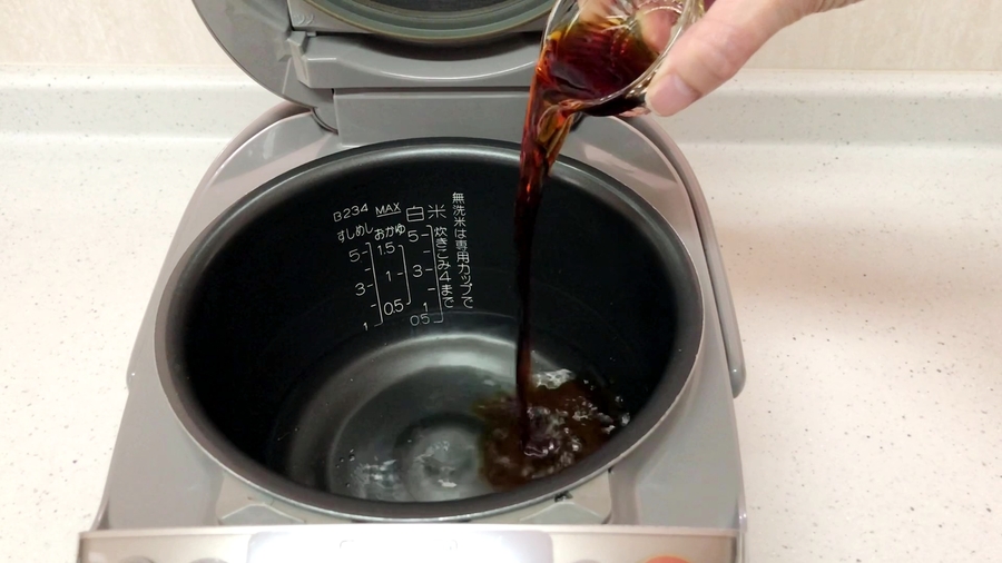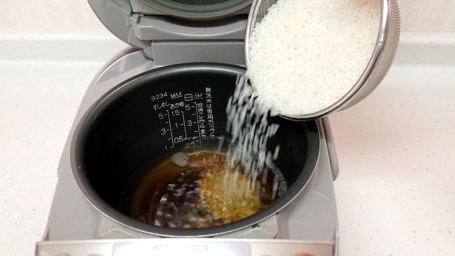 炊飯器の内釜に、水440㏄と【A】(淡口醤油大さじ2、酒大さじ1、みりん大さじ1)を入れます。
