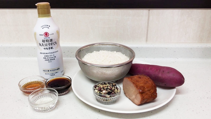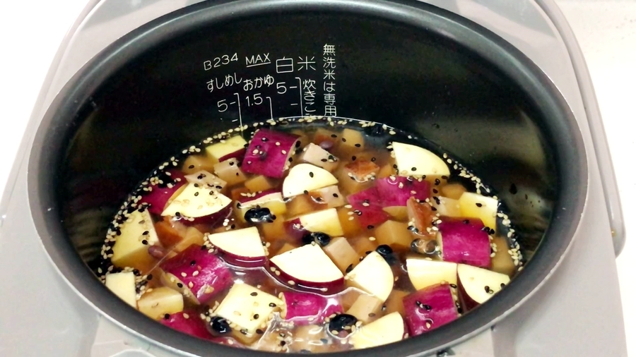 さらに切ったサツマイモ、焼き豚も散らしながら入れ、炊飯器のスイッチを入れます。