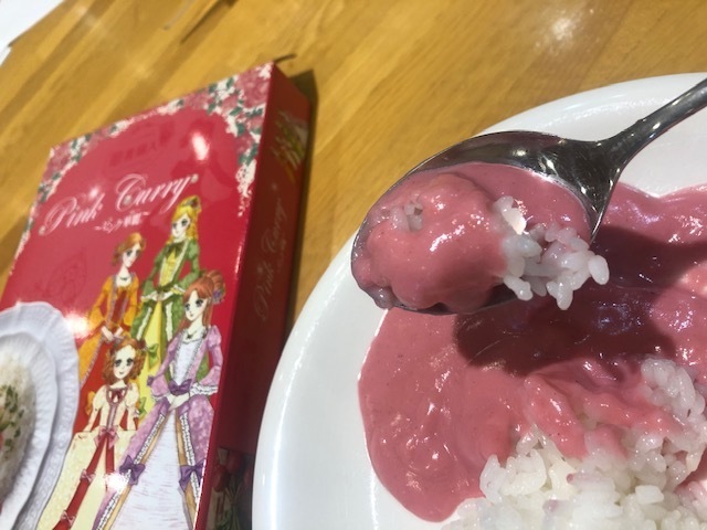 カレーなのにピンク、この衝撃に多田もアシスタントの桐生順子も驚きを隠せません。