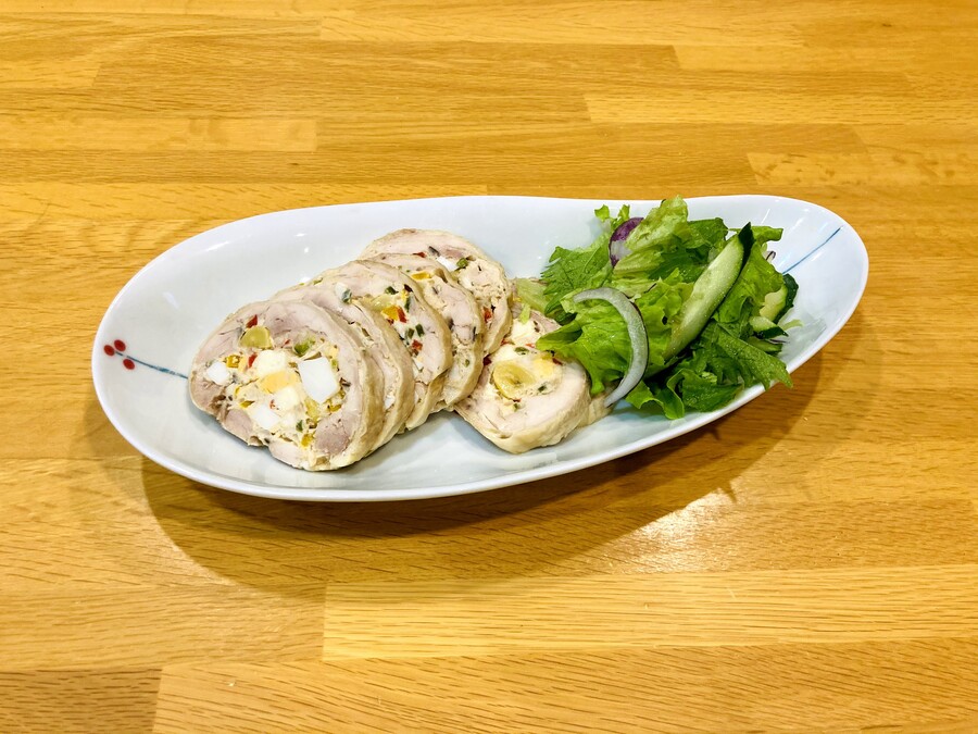 棒状に丸めた④を置いて、鶏もも肉で包み合わせて、