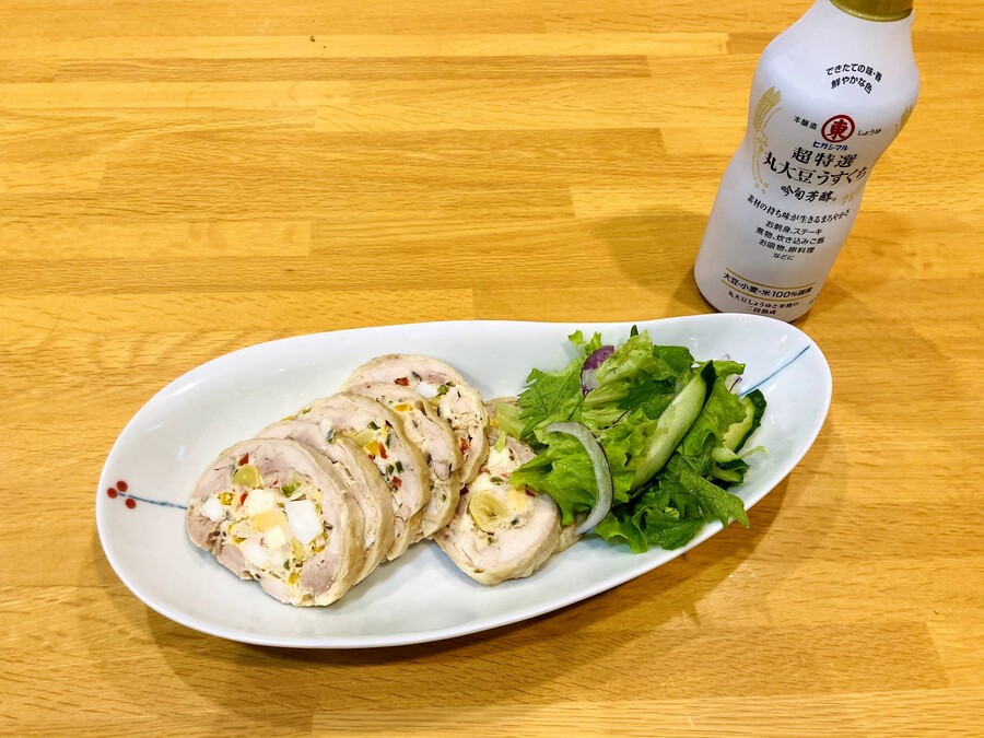 鶏もも肉の包んだ口を下にして、皿の上にのせます。