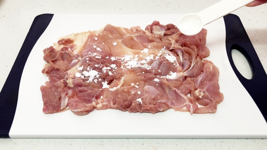 鶏もも肉1枚は観音開きのように、厚いところに切り込みを入れ、1.5倍くらいの大きさで均一に広げます。