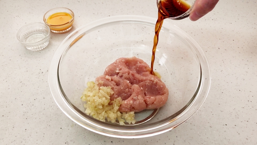 ボウルに【B】(鶏胸肉のひき肉150g、淡口醤油大さじ1、酒大さじ1、溶き卵1/2個)と炒めたタマネギを入れて、粘りが出るまでよく混ぜます。