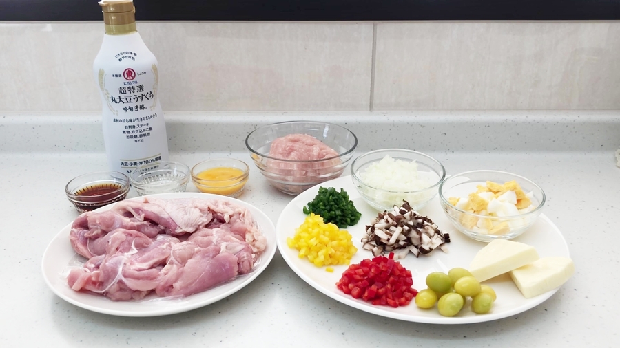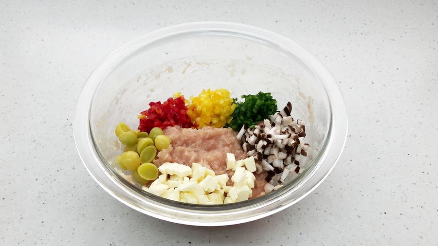 さらにそれぞれ粗みじんにした生シイタケ1枚、赤パプリカ大さじ2、黄パプリカ大さじ2、ピーマン大さじ2と半分に切ったぎんなん10個、5ミリ角に切ったプロセスチーズ2個を加えて、均一になるように混ぜます。