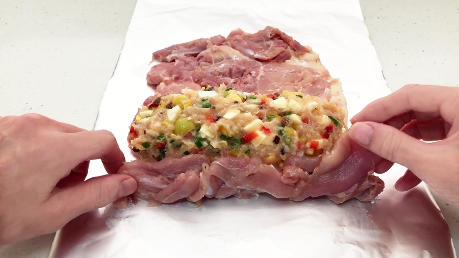 棒状に丸めた鶏胸肉のひき肉などを混ぜたタネを置いて、鶏もも肉で包み合わせます。