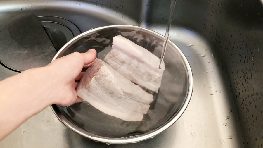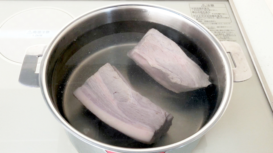 豚肉がしっかりと被るくらいたっぷりのお湯が鍋で沸いたら、火を止めて半分に切った豚肉を2,3分いれます。