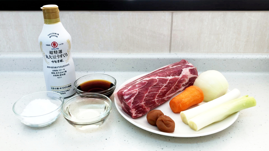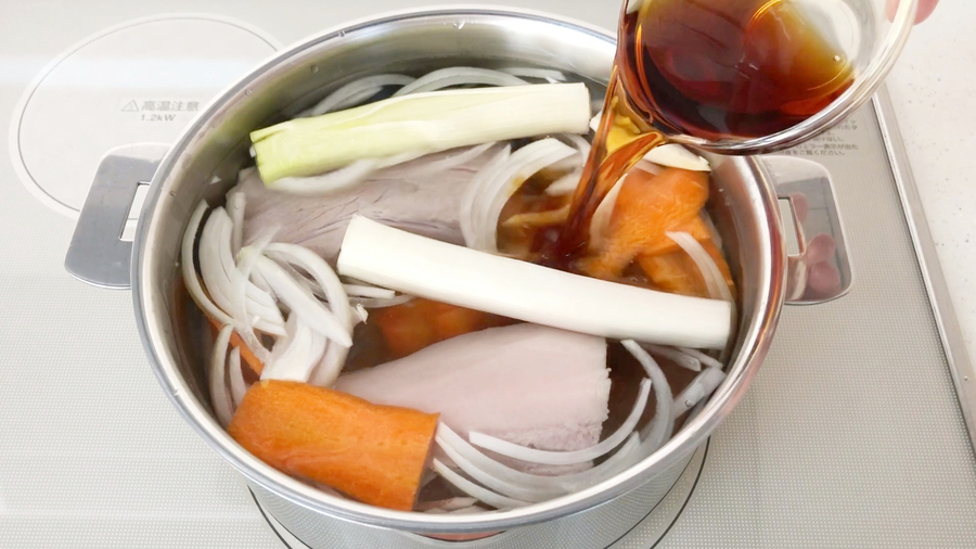 深鍋(今回は直径18センチ)に豚肉、ネギ、タマネギ、ニンジンを入れ、【A】(煎った酒1/2カップ、淡口醤油大さじ5、砂糖大さじ3、梅干し2個)も入れて、具材がすべて被るくらい、水を入れます。(今回の鍋であれば、水2~2.5カップ)