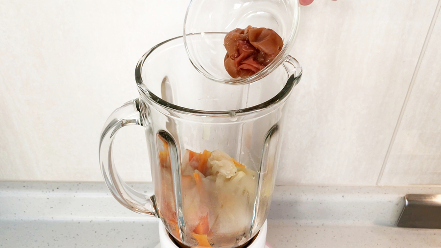 肉を取り出し、煮汁をこします。種を取った梅干し、ネギ、タマネギ、ニンジンをミキサーにかけ(濃さは煮汁を入れて調整し、【B】<淡口醤油、砂糖適宜>で味を調え)ペースト状にします。