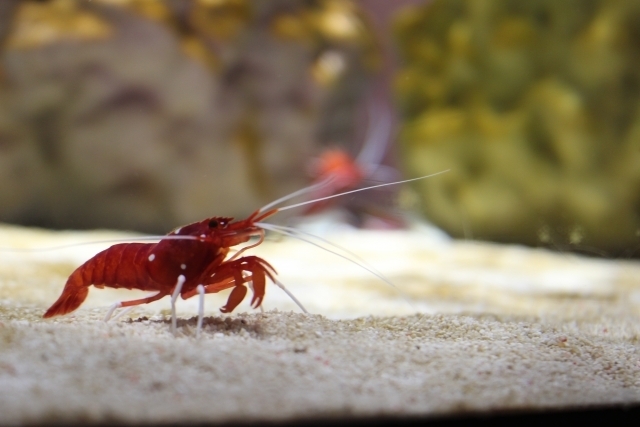 鮮やかな赤色に白色のドットを持つシロボシアカモエビ、別名ホワイトソックスと、赤地に白い縞模様を持つアカシマシラヒゲエビという2種類のエビが水槽にいます。