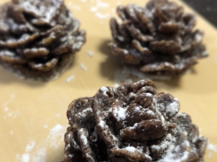 芯の部分にチョコフレークを刺し冷蔵庫で少し冷やすと、本当の松ぼっくりのような見た目に仕上がるというわけです。