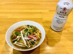 そこにお湯4カップに鶏がらスープの素小さじ2を溶いておいたものを入れ、