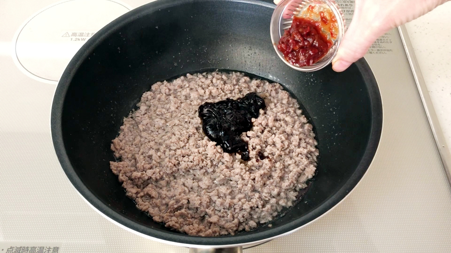 火を強火にして、1分くらいひき肉にしっかり絡めます。