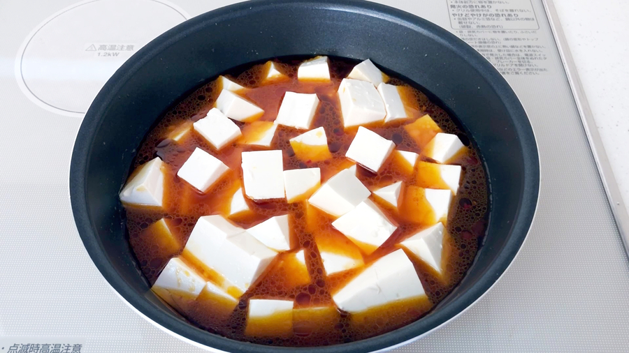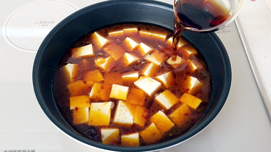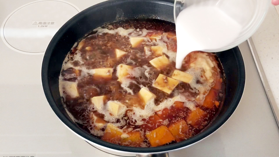 火力を強くして、グツグツしてきたら、水溶き片栗粉(片栗粉大さじ3、水大さじ4)を4,5回に分けて入れ、豆腐を崩さないようにかき混ぜ、とろみをつけます。