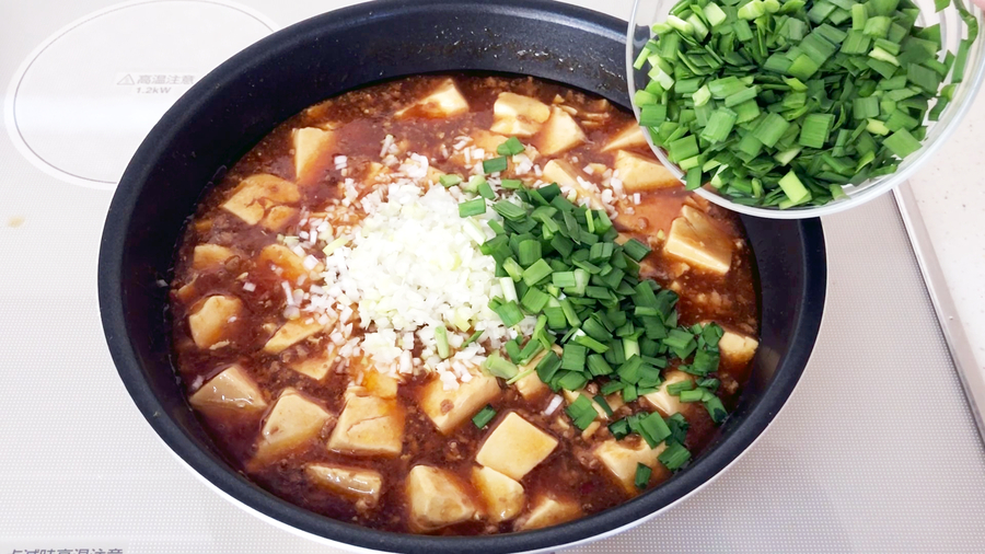 とろみがついたら、火を止めてみじん切りのネギ大さじ4、小口切りにしたニラ1/3把を