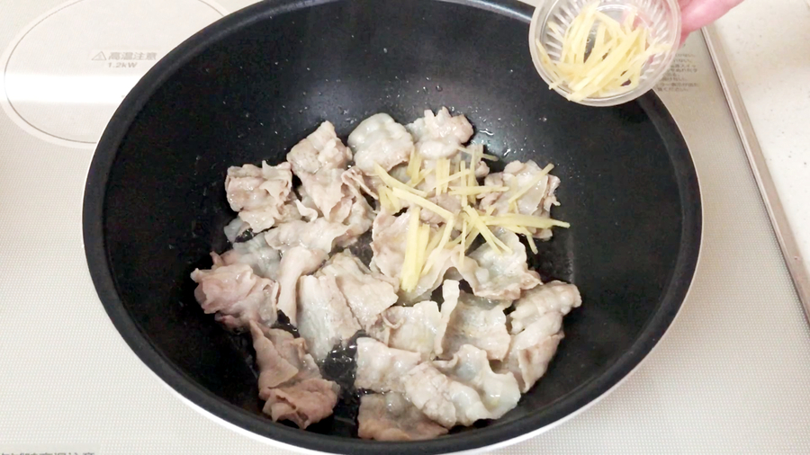 パラパラになったら、火を強めて、火が通ったら、切った生姜を入れて、30秒炒めます。