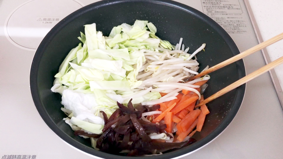 そこにほかの材料(もやし、キャベツ、ニンジン、キクラゲ、最後にニラ)を入れ、8割ほど火を通し、炒めて、火から外します。