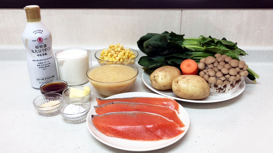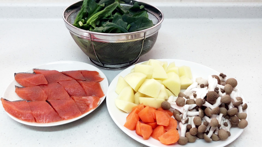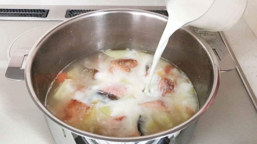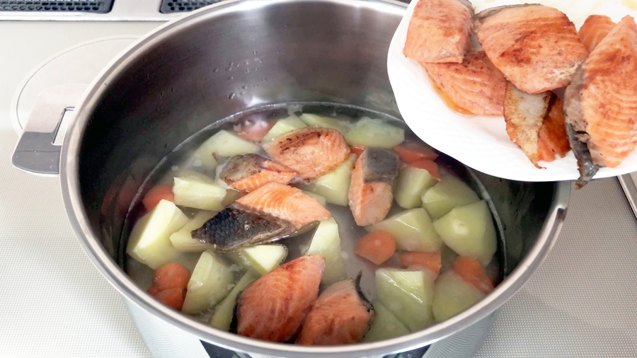 焼いた鮭をジャガイモ、ニンジンを煮ている鍋に入れます。