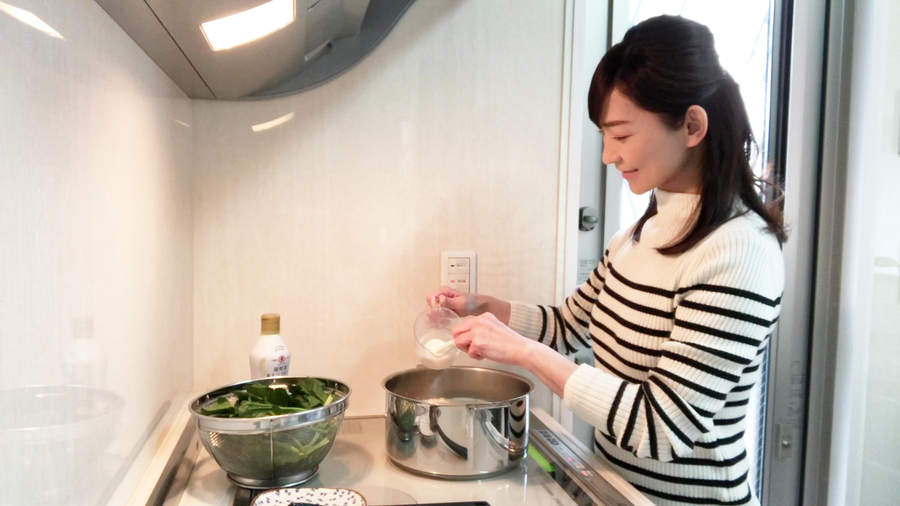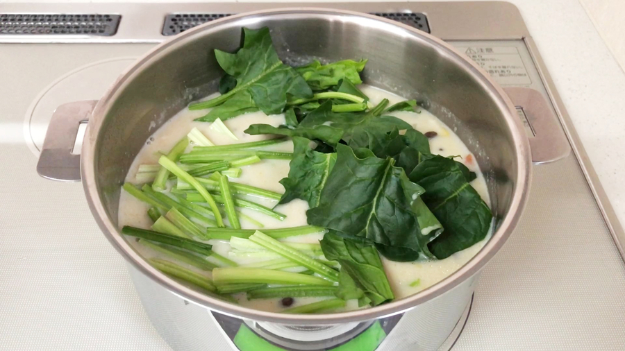水溶き片栗粉(片栗粉大さじ1と1/2、水大さじ3)でとろみをつけます。そのあと、切ったほうれん草を入れ、ほうれん草にも火を通します。