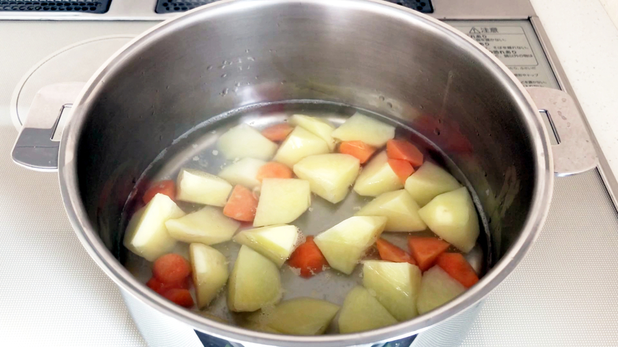 4人用くらいの大きさの鍋(土鍋など)に水2カップを入れたら、ジャガイモ、ニンジンを入れ、弱火と中火の間くらいの火にかけて煮ます。