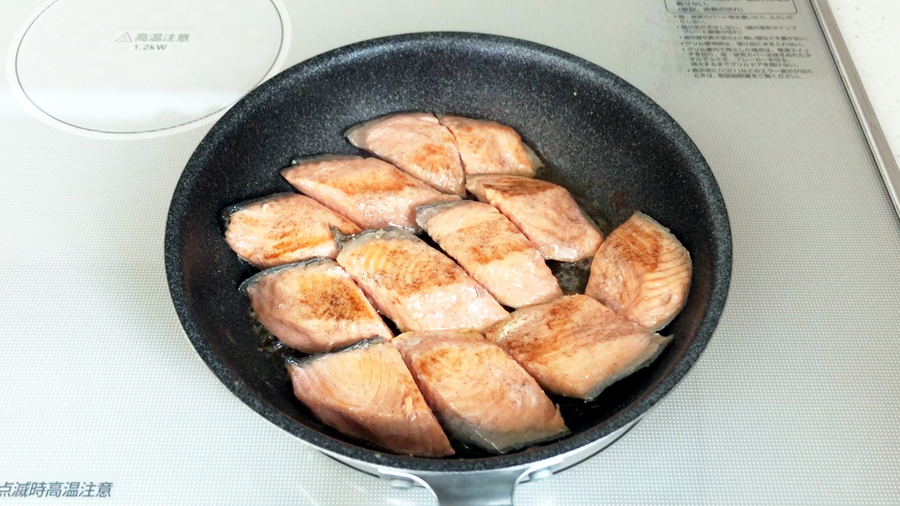 フライパンでバター大さじ1を熱し、鮭を入れ、表面に焼き色を付けます(アク止め、煮崩れ防止、香ばしさアップ)
