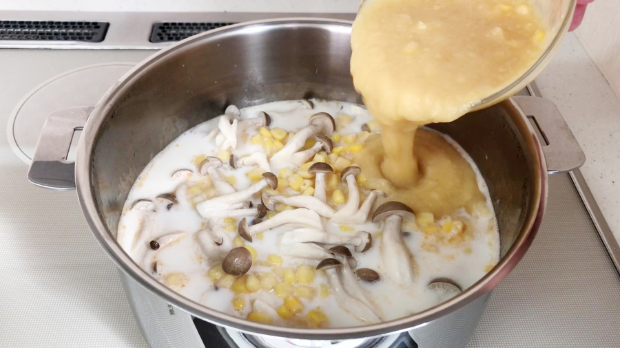 さらに石づきを切り落として小房に分けたシメジ1パック、クリームスタイルのコーン1パック、水気を切ったホールスタイルのコーン1パックを入れます。