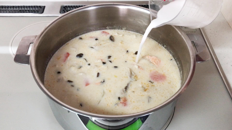鍋を沸騰させ、アクをとり、鶏がらスープの素大さじ1/2、牛乳1と1/2カップを鍋に入れます。