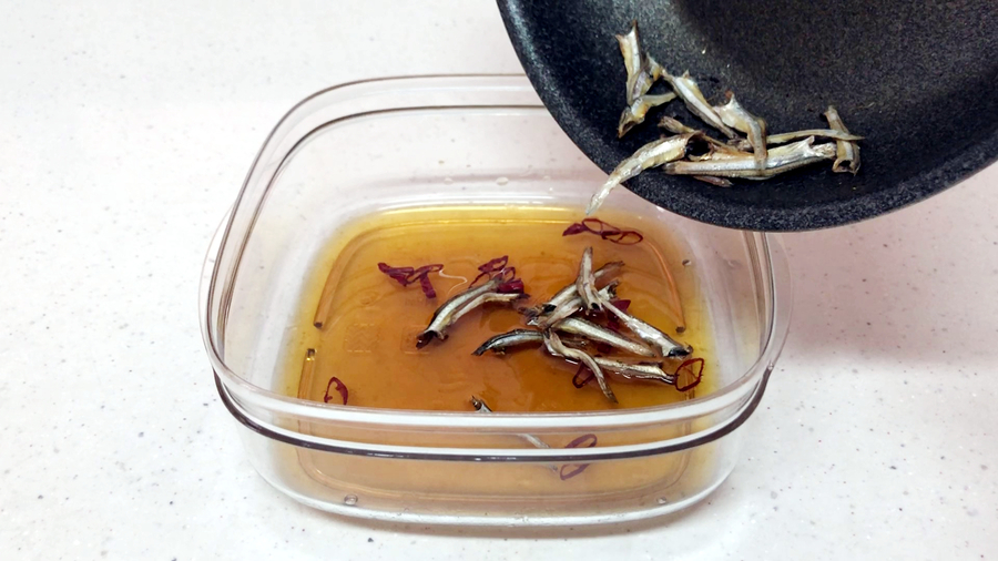 煮干し5gは頭を取り、フライパンで乾煎りしてタレに入れます。